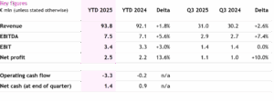 For the first nine months, revenue increased by 1.8% with net profit amounting to € 2.5 million (Q1–Q3 2024: € 2.2 million). Due to the strong cash flow (+€ 5.7 million) in the third quarter, the cash position recovered to a positive € 1.4 million.